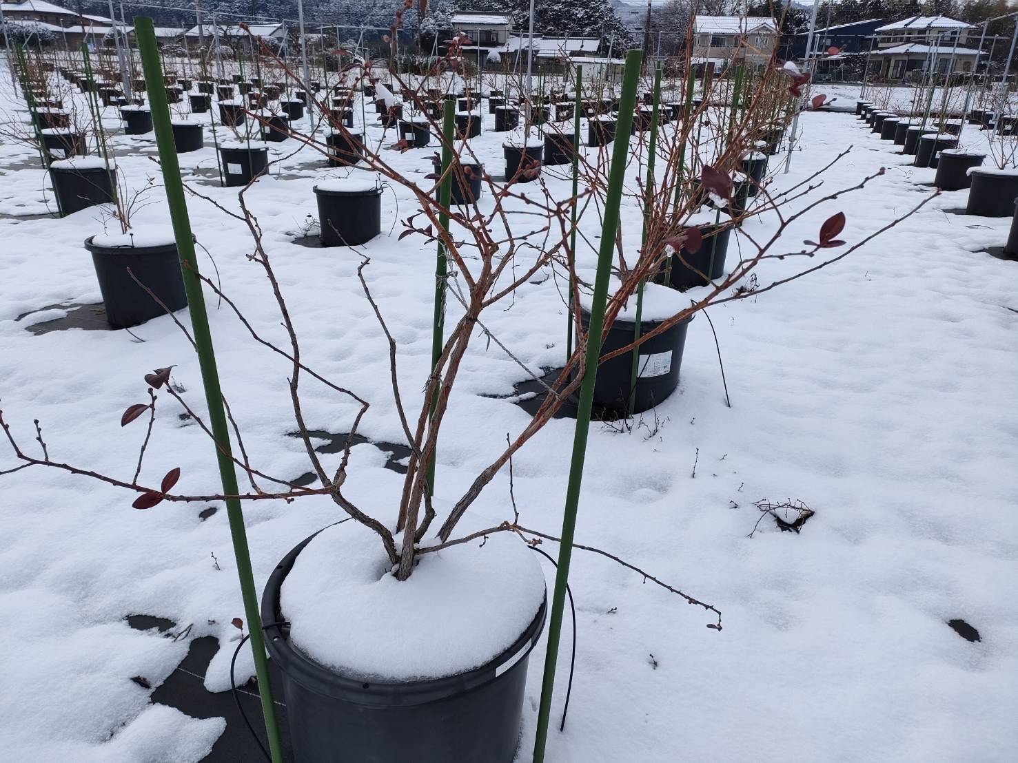 ブルーベリーは寒さに強い果樹で-10度までは元気に育ちます。品種によっては‐20度まで耐えるため、北海道でも栽培することが可能です。雪が30cm以上積もる地域では枝が折れないように雪囲いをする必要がありますが、埼玉では必要ないためそのままにしています。